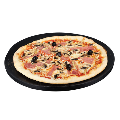 Tomates, olives, jambon, champignons de Paris frais, mozza, crème fraîche